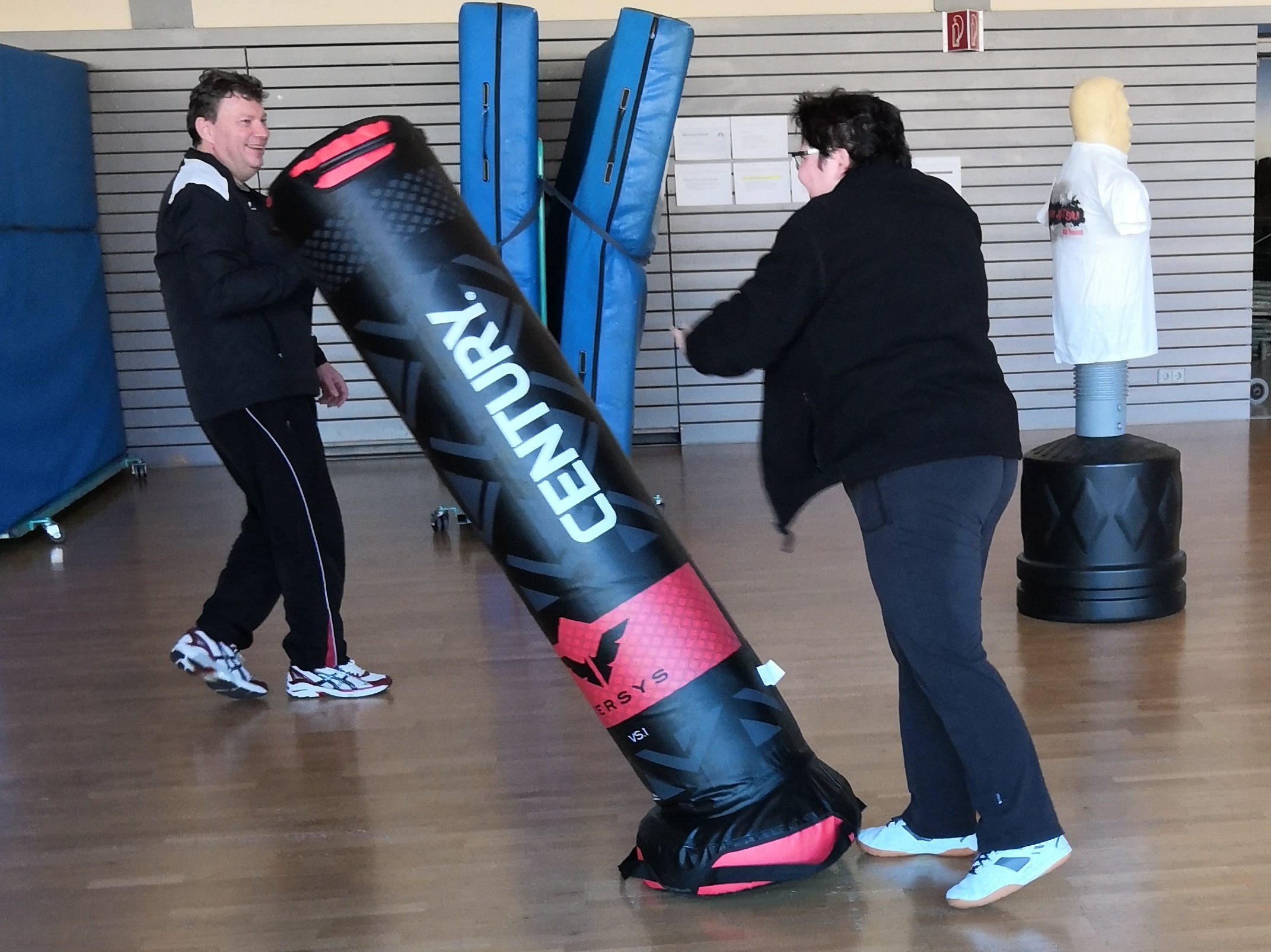 Der berühmte Tritt in den UnterleibViele Fragen tauchten rund um das Thema “Einsatz von Selbstverteidigungswaffen“ auf. Übungsleiter Ralf Hüber gab zu allen gestellten Fragen Antworten und Tipps. Zum Abschluss der Kurse konnten sich die Teilnehmerinnen von Sinn und Zweckmäßigkeit  sogenannter Pfeffersprays ein Bild machen  und unter strengen Sicherheitsvorkehrungen, Tierabwehr-Spray oder Übungsspray auf Wasserbasis selbst „abfeuern“.